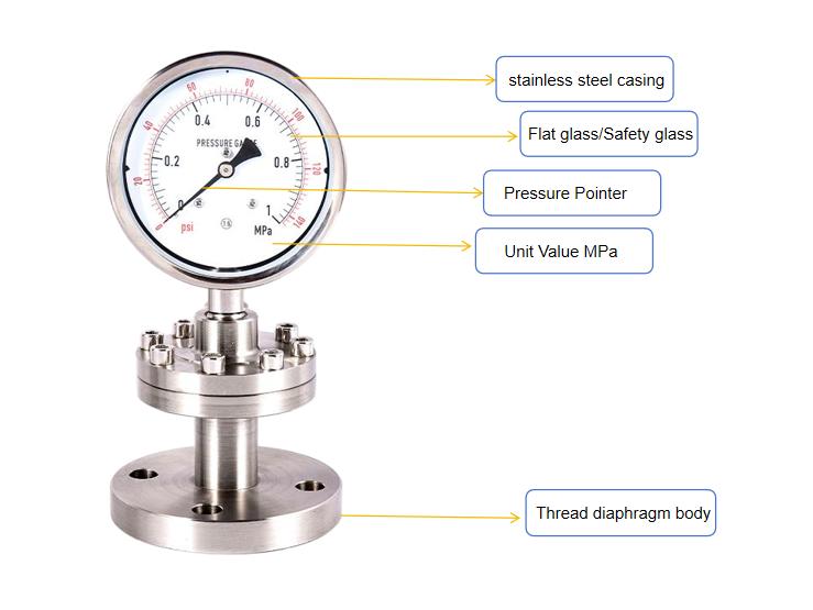 Kärnstrukturen involverar installation av ett membranförslutningssystem (allmänt känt som en "membranklämma" eller "fläns") mellan den vanliga tryckmätaren och det uppmätta mediet. Trycket överförs genom en tätningsvätska som kallas "fyllningsvätska" (såsom silikonolja), så att frätande, viskösa eller högtemperaturmatmedier inte direkt kontaktar de känsliga elementen (bourdonröret) i tryckmätaren, och därigenom skyddar instrumentet och säkerställer mätningens noggrannhet och hygien.